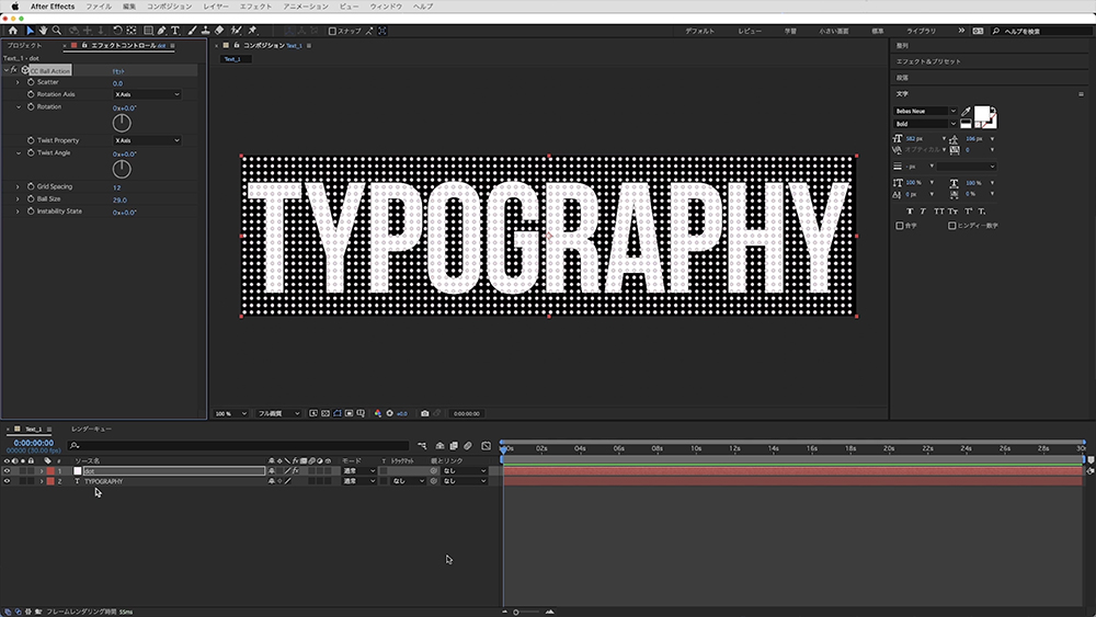 「dot」に「エフェクト」>「シミュレーション」>「CC Ball Action」を適用します。
