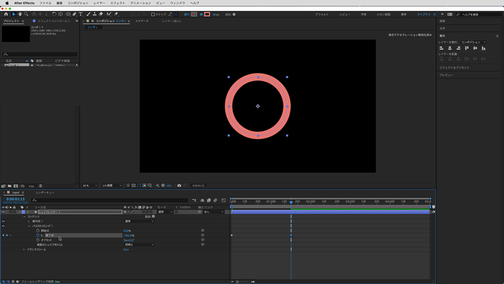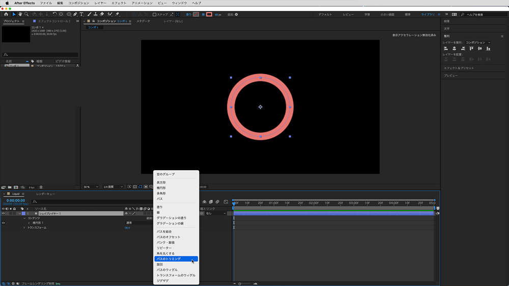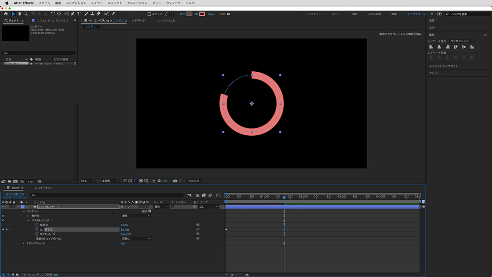 シェイプレイヤーで円を描画し「パスのトリミング」を追加します。