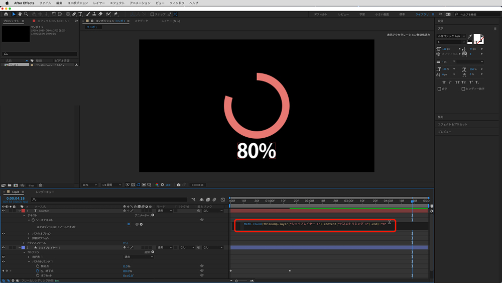 「終了点」の値にキーフレームを打つと円を描画するアニメーションがつきます。今回は最後を100%ではなく80%の値にしました。この値をカウンターに連動させていきます。