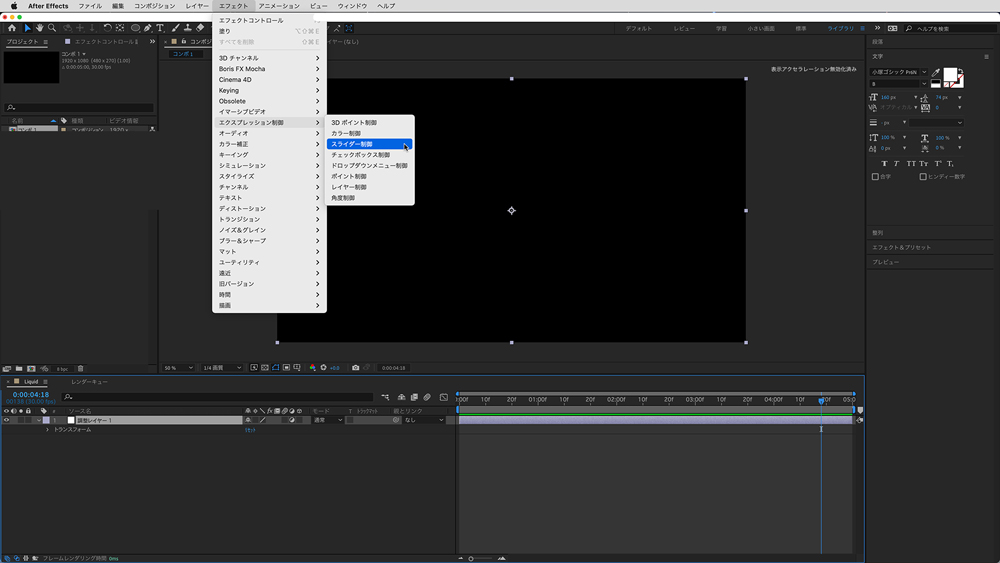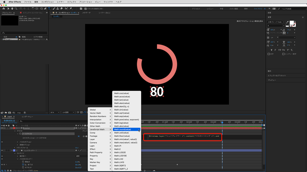 カーソルをエクスプレッション編集エリアの先頭に合わせた状態で「ソーステキスト」のピックウィップ横にある「▶」から「JavaScriptMath」>「Math.round(value)」を選択する。