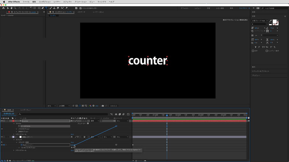 以降は、先程と同じ様にピックウィップを使い、エクスプレッション編集をすれば、カウンターだけを表示させることができます。