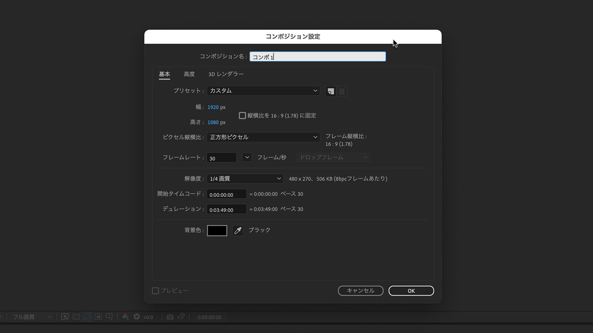 コンポジションの設定はいつでも変更することができますが、最終出力に影響が出ることがあるので、コンポジション作成時に、最終出力を考慮してフレームの縦横比やサイズなどを設定しておくことをお勧めします。