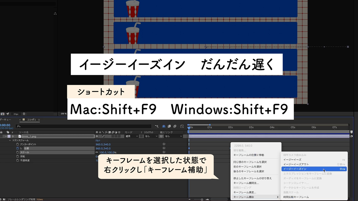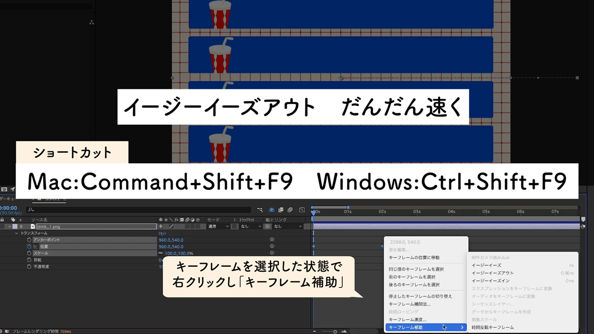 Adobe AfterEffectsでもかなり細かく設定することができますが、まずは基本機能にあり、クリックまたはショートカットだけでつけることができる「イージーイーズ」「イージーイーズアウト」「イージーイーズイン」を使えるようになると便利です