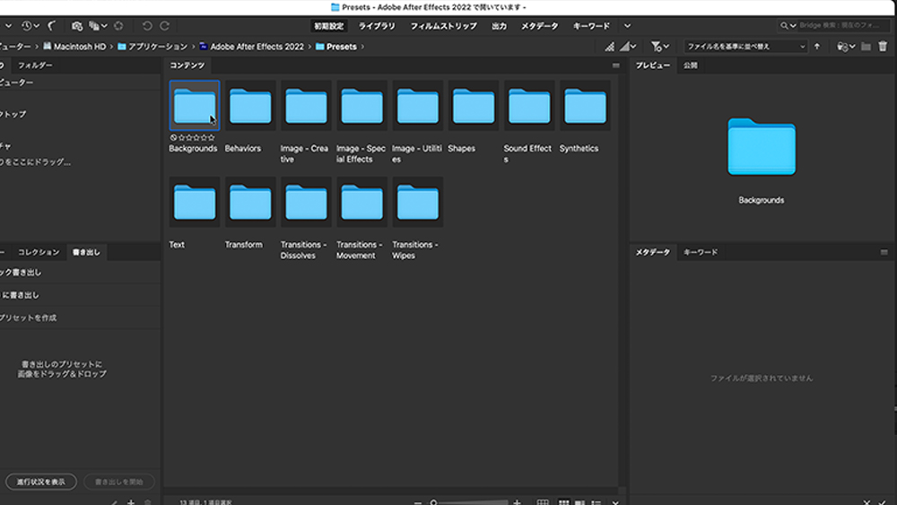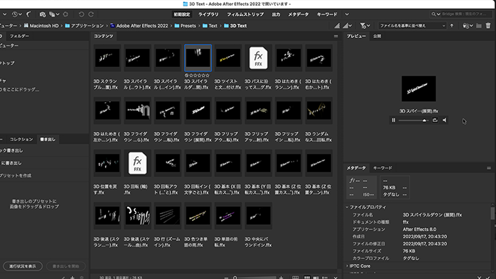 カテゴリフォルダが表示され、そのフォルダ内にはプリセットがあり、各プリセットがどのようにアニメーションするのか、エフェクトがかかるのかをプレビューして確認することができます。